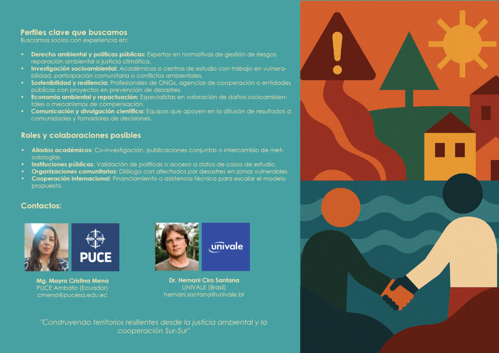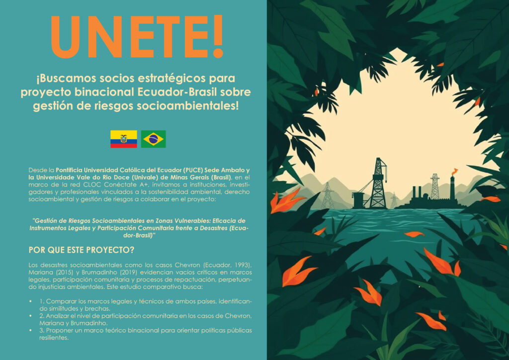 Desde la Pontificia Universidad Católica del Ecuador (PUCE) Sede Ambato y la Universidade Vale do Rio Doce (Univale) de Brasil, se impulsa un nuevo proyecto binacional orientado a fortalecer la gestión de riesgos socioambientales en zonas vulnerables, desde un enfoque comparativo, participativo y de justicia ambiental.